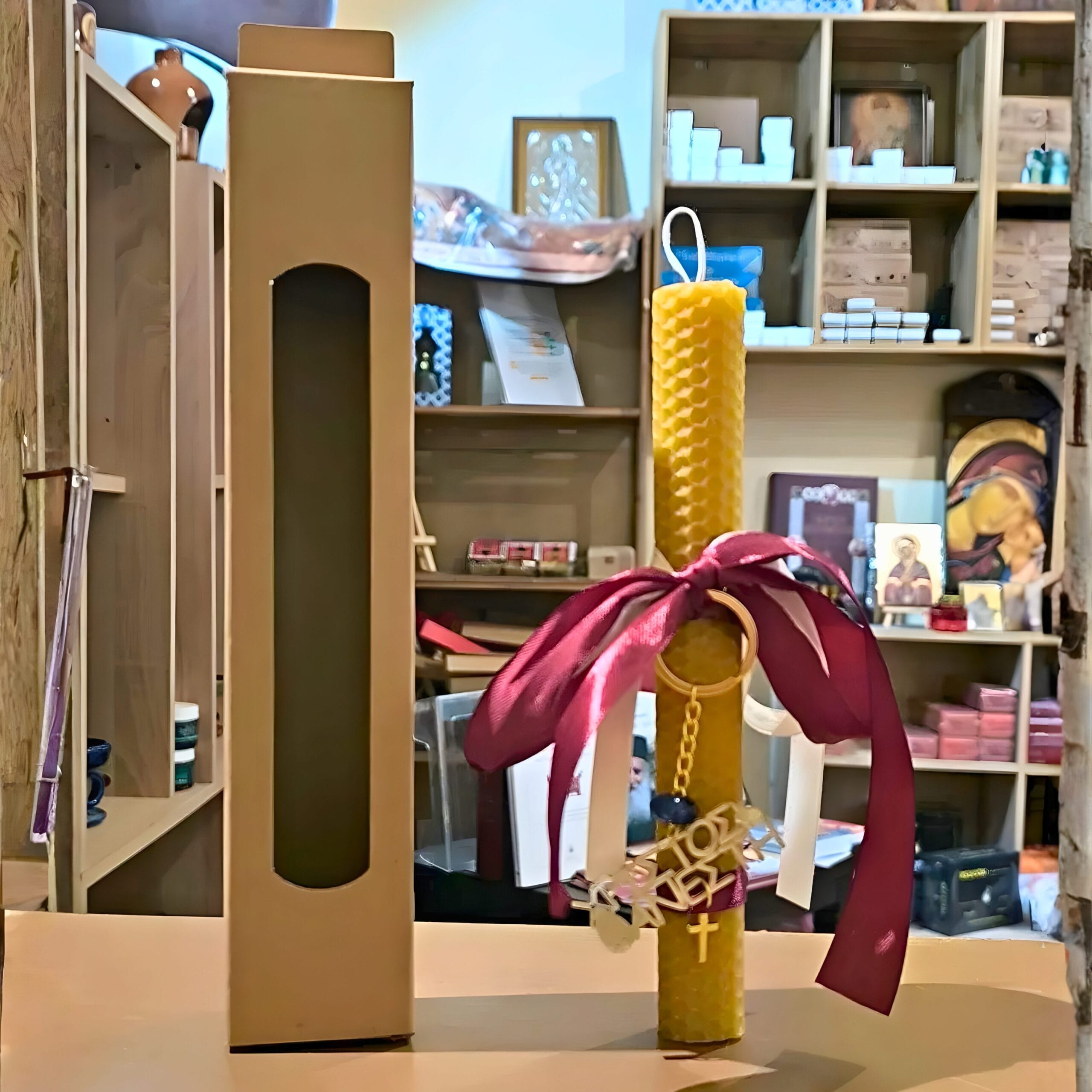Vela de Panal de 20cm con Cinta Burdeos e Inscripción Cristo ha Resucitado.