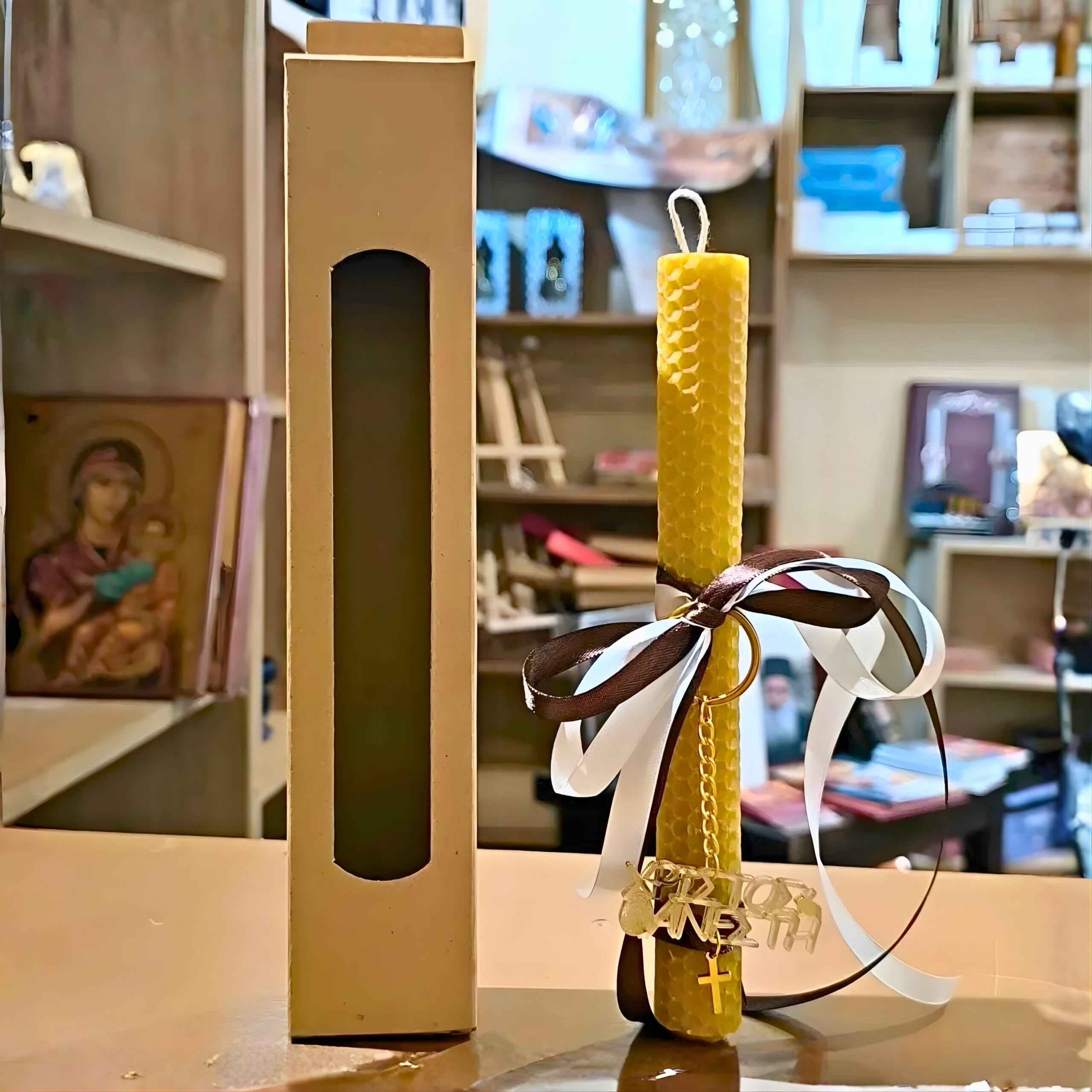 Dekorēts ar dubultu satīna lentīti bordo un baltā krāsā, uz tā ir niķelēts uzraksts. "Kristus ir augšāmcēlies", spilgts zila pērlīte un žetons zelta krustsSvece, kas apvieno tīra vaska kvalitāti ar estētisku izcilību. TAS NĀK KOPĀ AR PAPĪRA KASTI. PRIORITĀTE ELEKTRONISKOS MAKSĀJUMOS