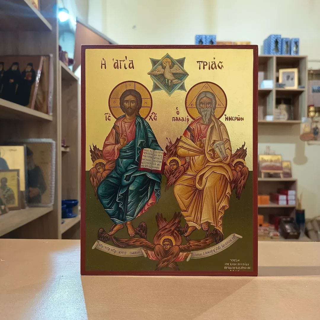 Εικόνα Αγίας Τριάδας Ξύλινη Χρυσωμένη. Η Εικόνα είναι ειδικά επεξεργασμένη με βερνίκι για να έχει την μέγιστη αντοχή στον χρόνο και τις φθορές.