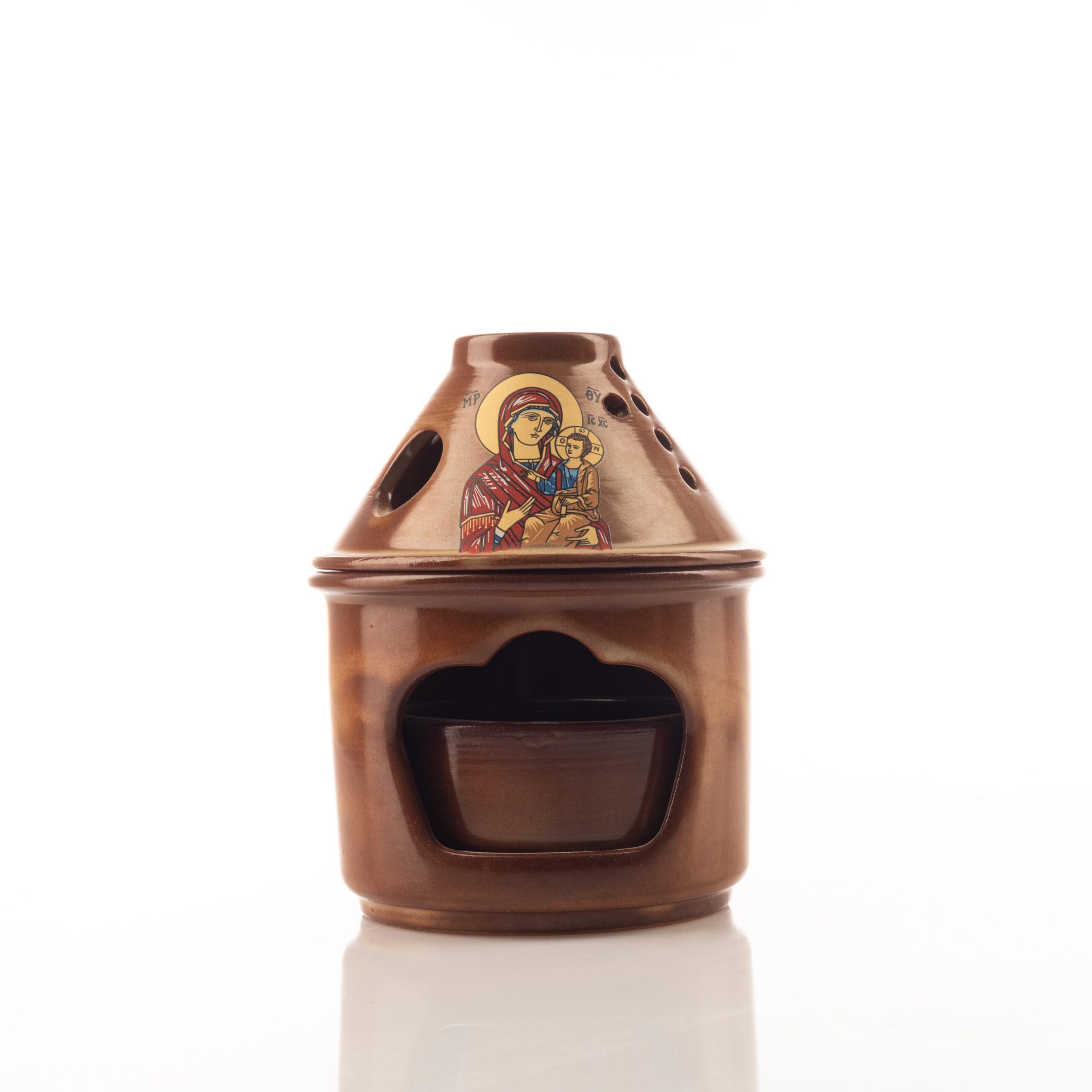Καντήλι Κεραμικό μικρό Φάτνη Θεομήτωρ καφέ. υαλωμένο ανθεκτικό στην καύση. Επιτραπέζιο καντήλι σε σχήμα καμπάνας. Εικονίζει την Υπεραγία Θεοτόκο Αριστεροκρατούσα. Περιέχει καντηλόκουπα.
