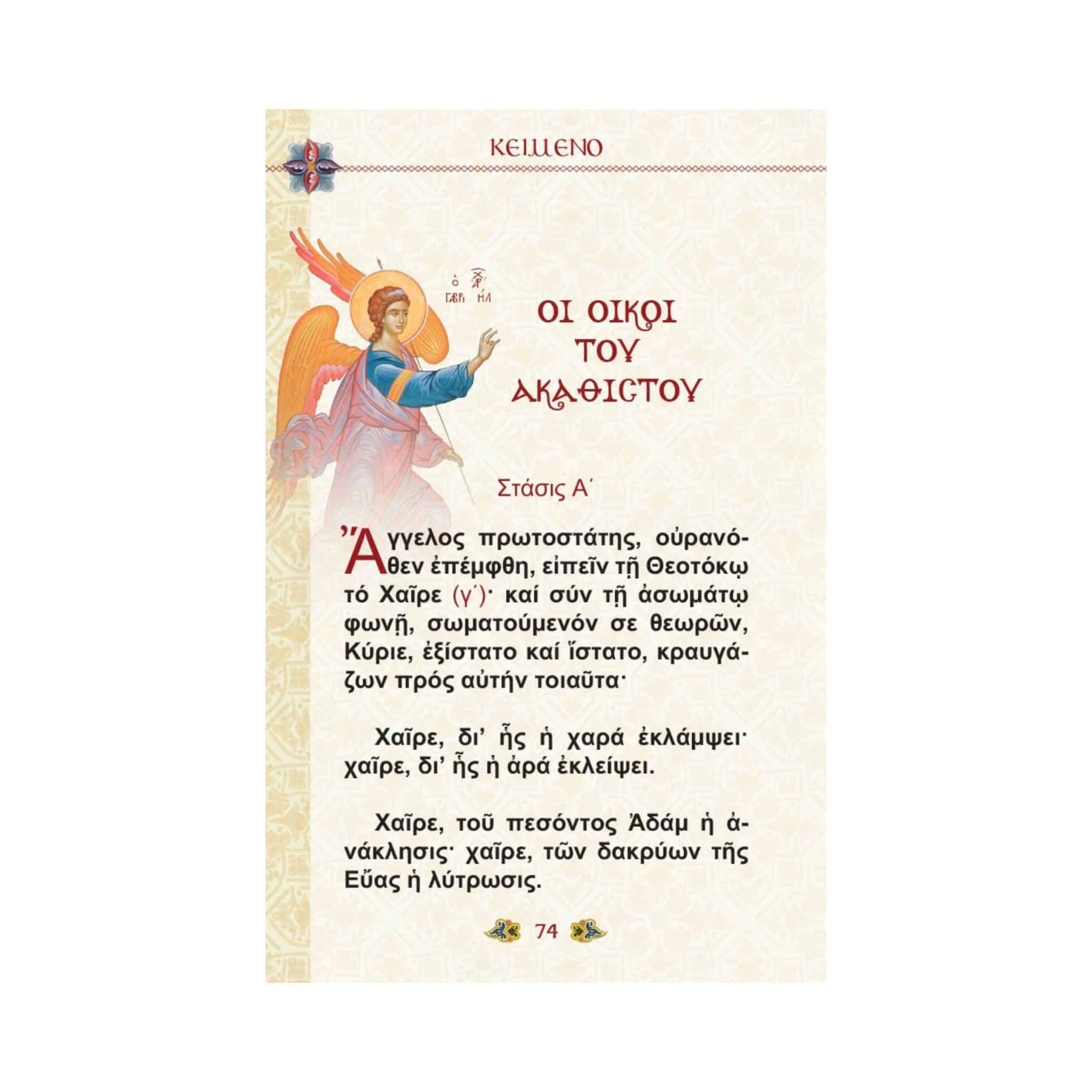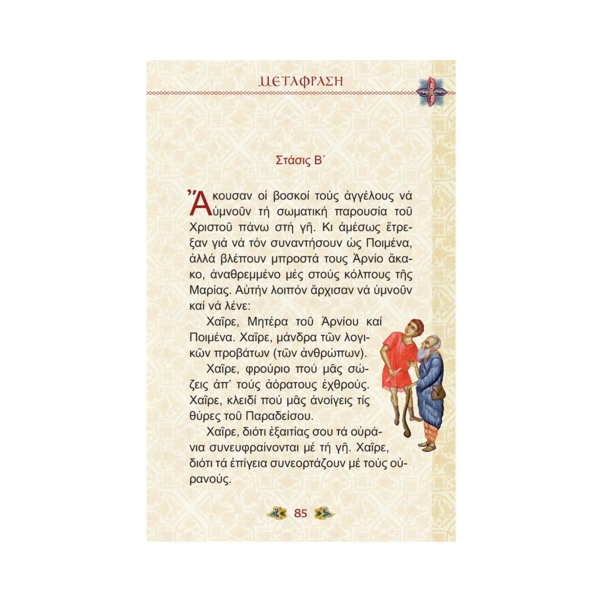 Ο Ακάθιστος Ύμνος με μετάφραση στη Δημοτική. Εγκόλπιο με την ακολουθία του Ακαθίστου Ύμνου στο πρωτότυπο και παράλληλη μετάφραση στη δημοτική.