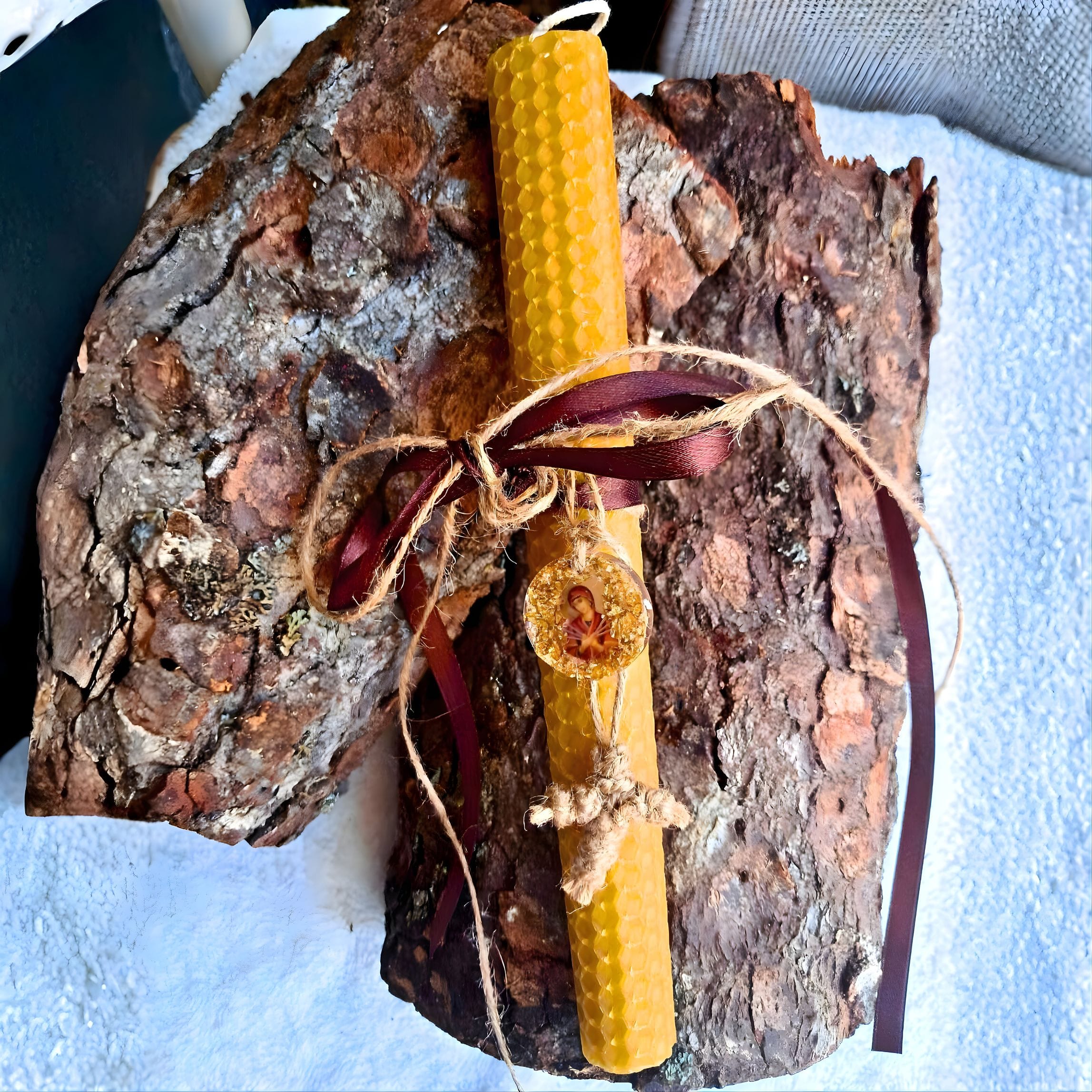 Ένα μοναδικό, πνευματικό δώρο για το Πάσχα. Χειροποίητη λαμπάδα 20εκ. κατασκευασμένη από 100% φυσική κηρήθρα μελισσοκεριού, τυλιγμένη γύρω από βαμβακερό φιτίλι. Ξεχωρίζει για το ιδιαίτερο διακοσμητικό μενταγιόν που φέρει εικόνα της Παναγίας της Επτάσπαθης σε υγρό γυαλί, πλαισιωμένο από καφέ κορδέλα σατέν, φυσικό σπάγγο και έναν πλεκτό σταυρό. Μια λαμπάδα που συνδυάζει ποιότητα και βαθιά παράδοση.