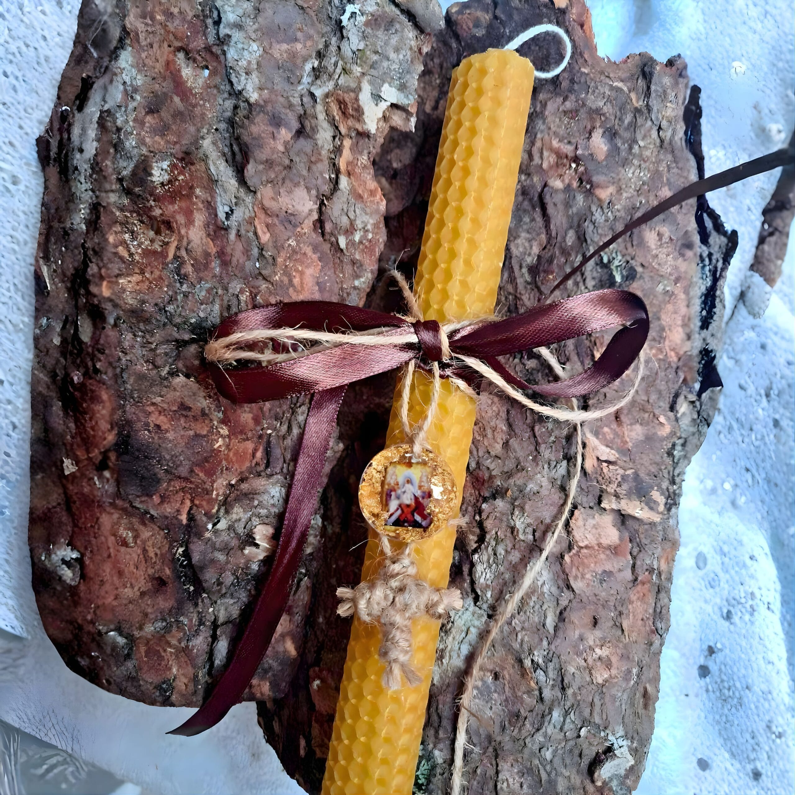 Η αυθεντική γοητεία της παράδοσης σε μια λαμπάδα που ξεχωρίζει. Χειροποίητη λαμπάδα ύψους 20εκ. και πάχους 2,5εκ., φτιαγμένη από φύλλο 100% φυσικής κηρήθρας (μελισσοκέρι). Αυτό το μοναδικό κομμάτι είναι περίτεχνα στολισμένο με μια πλούσια μπορντό κορδέλα, φυσικό σπάγγο και έναν χειροποίητο πλεκτό σταυρό, πλαισιώνοντας μια πανέμορφη εικόνα της Ανάστασης από υγρό γυαλί.